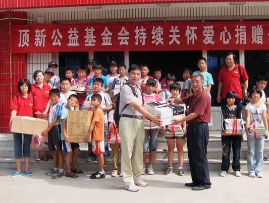 各公司的同仁中募集到了丰富的少儿图书,题材囊括了科普、故事、品德教育、学习辅导等众多种类,数量近500册,整理好后于8月19日,在天津蓟县顶新小学的校园里,校长及师生从集团各公司的同仁志愿者手中,接过了基金会捐赠的近500册的爱心图书和玩具,以及打印机、耗材等。