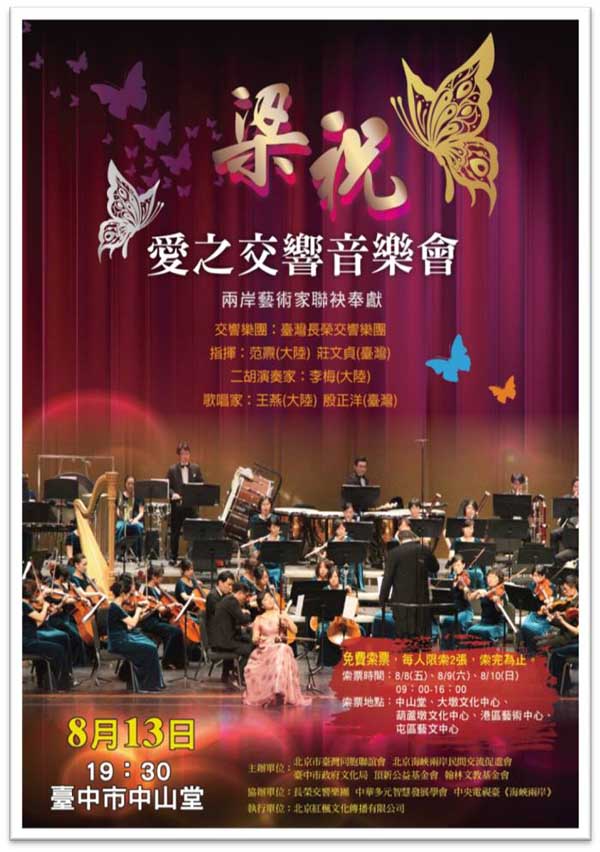 “2014年两岸喜福会暨梁祝爱之交响音乐会”由北京中国广播电影交响乐团与台湾长荣交响乐团艺术家共同演绎两岸经典,于8月6-13日分别在台南、台中巡演,推动两岸文化交流。