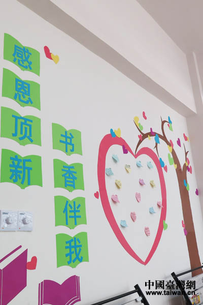 在图书室的墙上,贴满了学生们对捐赠图书室的感谢,一张卡片上写着:7千册书对一个普通小学意味着什么?这是科技,是梦想,是发展。谢谢顶新给了我们实现梦想的机会。我们虽然不能在视野上帮助你们,但我们会在精神上做无声的回报!