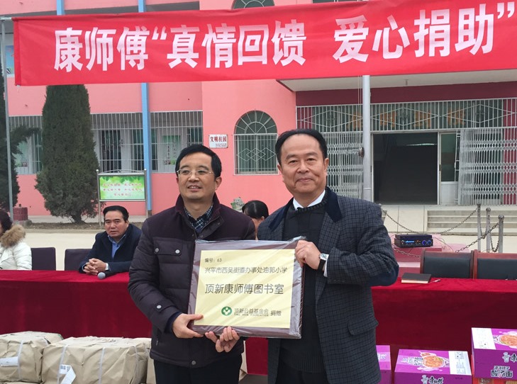 2015年12月08日上午,“顶新康师傅图书室”交付仪式在陕西省兴平市西吴街道办油郭小学隆重举行。康师傅西北区董事长陈亮誌、咸阳福满多厂长夏鹏刚以及兴平市政协副主席张娟、兴平市教育局局长李参顿、西吴办教委主任符红志、油郭村党支部书记郭涛等相关领导共同出席了此次交付仪式。