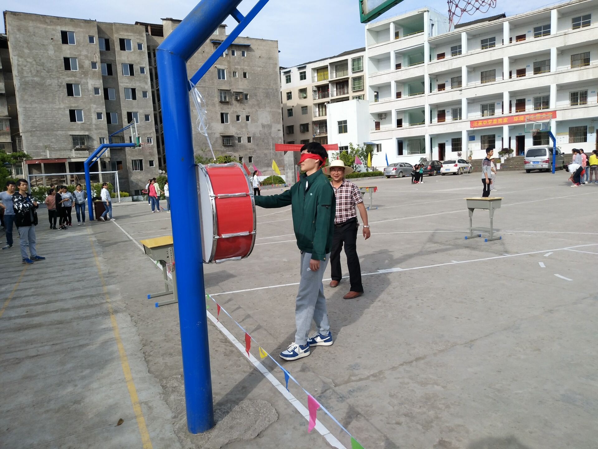 学校为同学们准备了各种各样的游戏项目:盲人敲鼓、同舟共济、手弹硬币、踢毽子、转呼啦圈、定点投篮等。游园活动一开始,各个游戏点就排起了长龙。同学们你争我夺,摇旗助威,尽情的挥洒着属于青春的汗水。