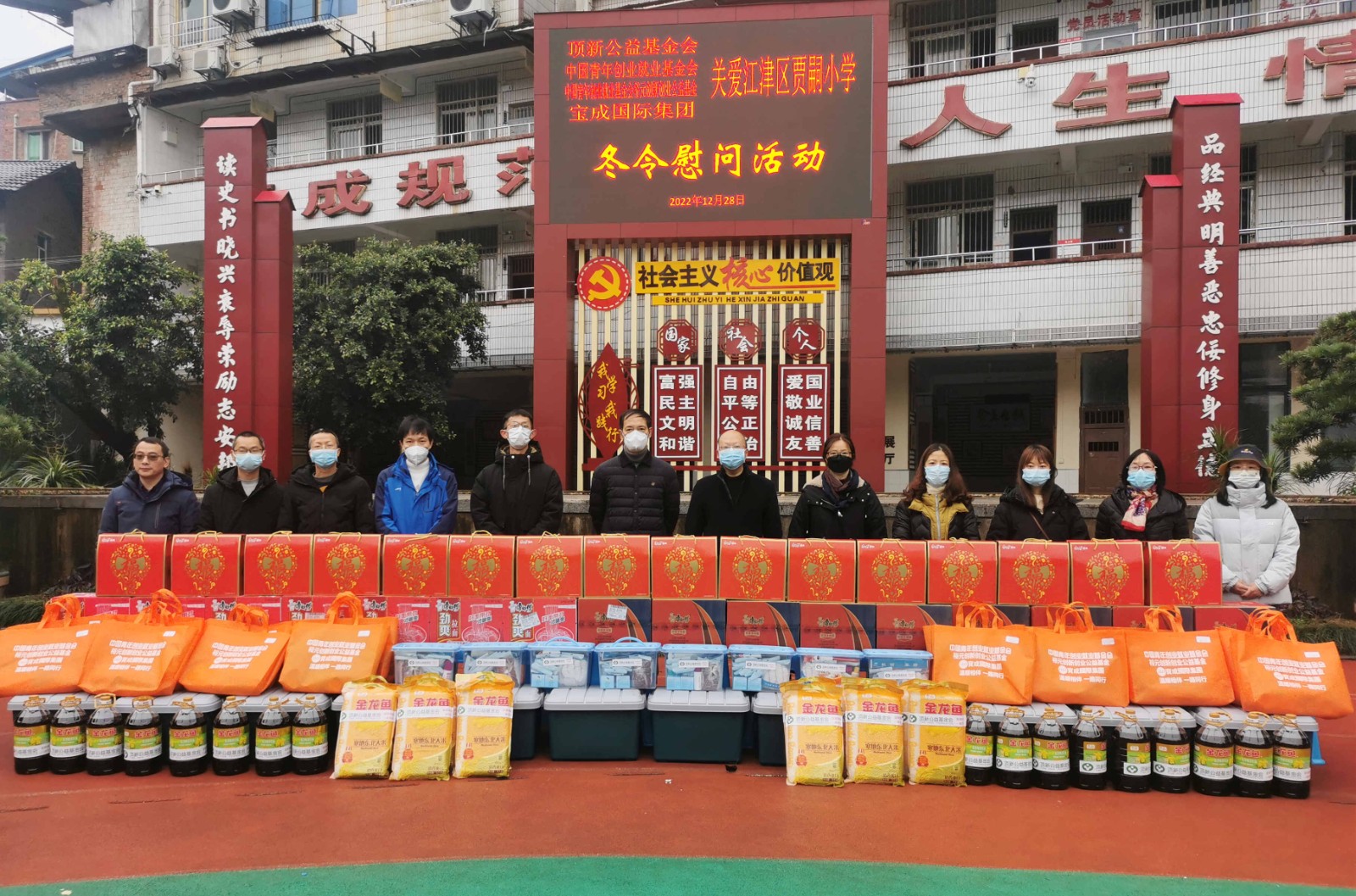 岁寒时节见真情,寒冬慰问暖人心。在2022年12月23日,重庆留守青少年困难家庭冬令慰问活动正式启动。基金会今年准备了温暖的棉服外套、凉被、环保毯、围巾手套、置物箱、大米、食用油、医疗包、康师傅方便面、康师傅糕饼礼盒等非常丰富的各类生活用品,在2023年新年到来之际为16所学校的350户困难家庭送去温暖和祝福。