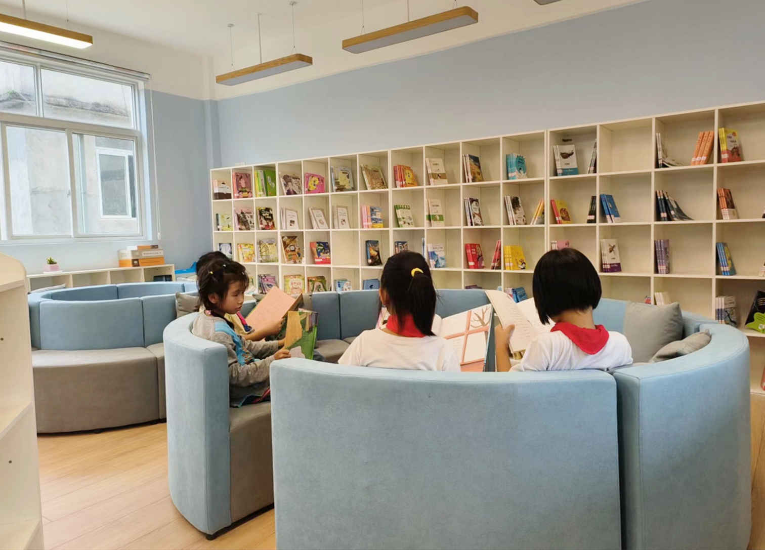 四川雅安市雨城区晏场镇中心小学图书室采用了明亮淡雅的浅蓝色和白色的家具进行搭配,并配以不规则造型的软沙发,希望孩子们在完全放松的状态下,书籍的沁润下,展开丰富的想象力,描绘自己的星辰大海。