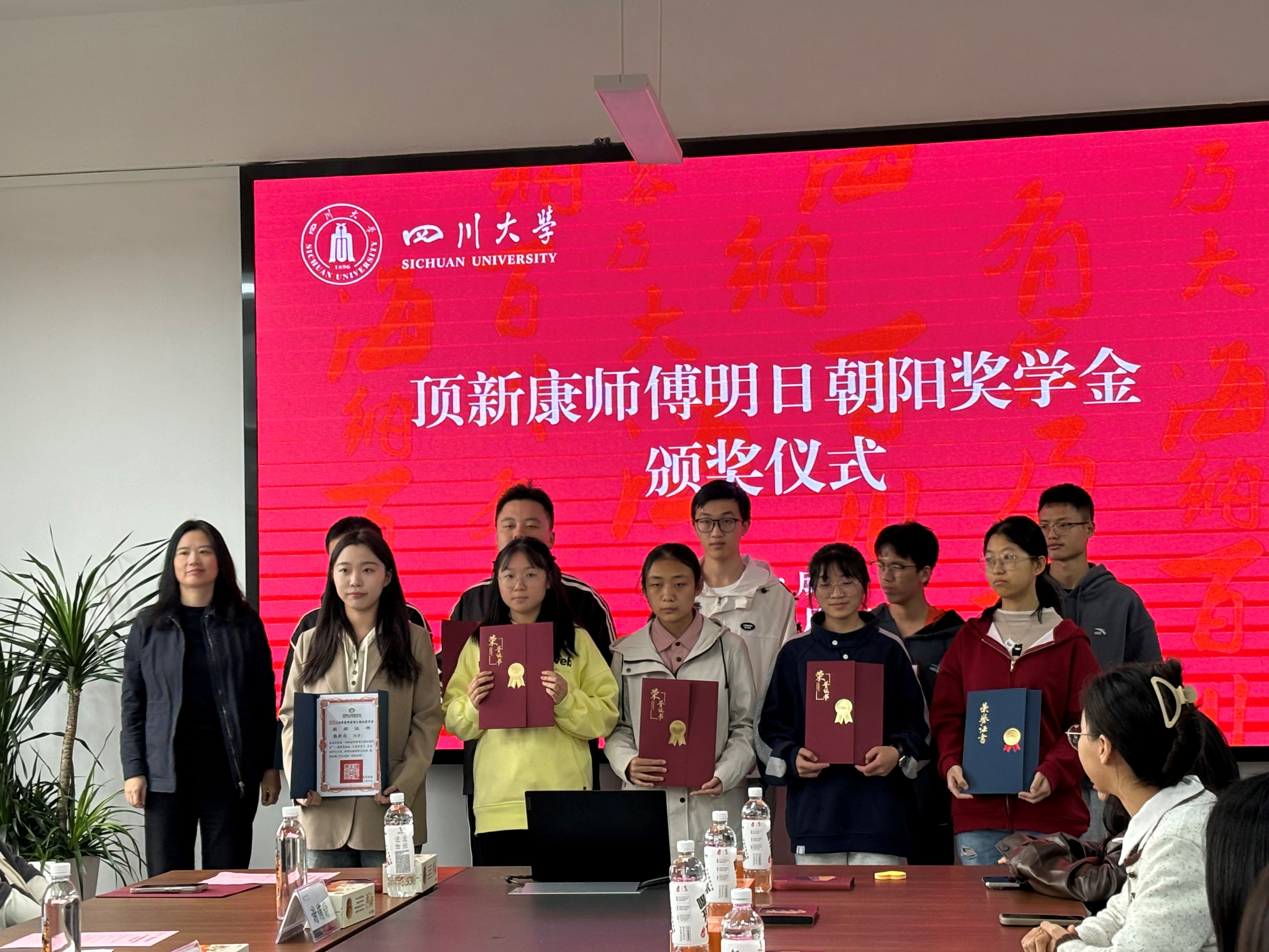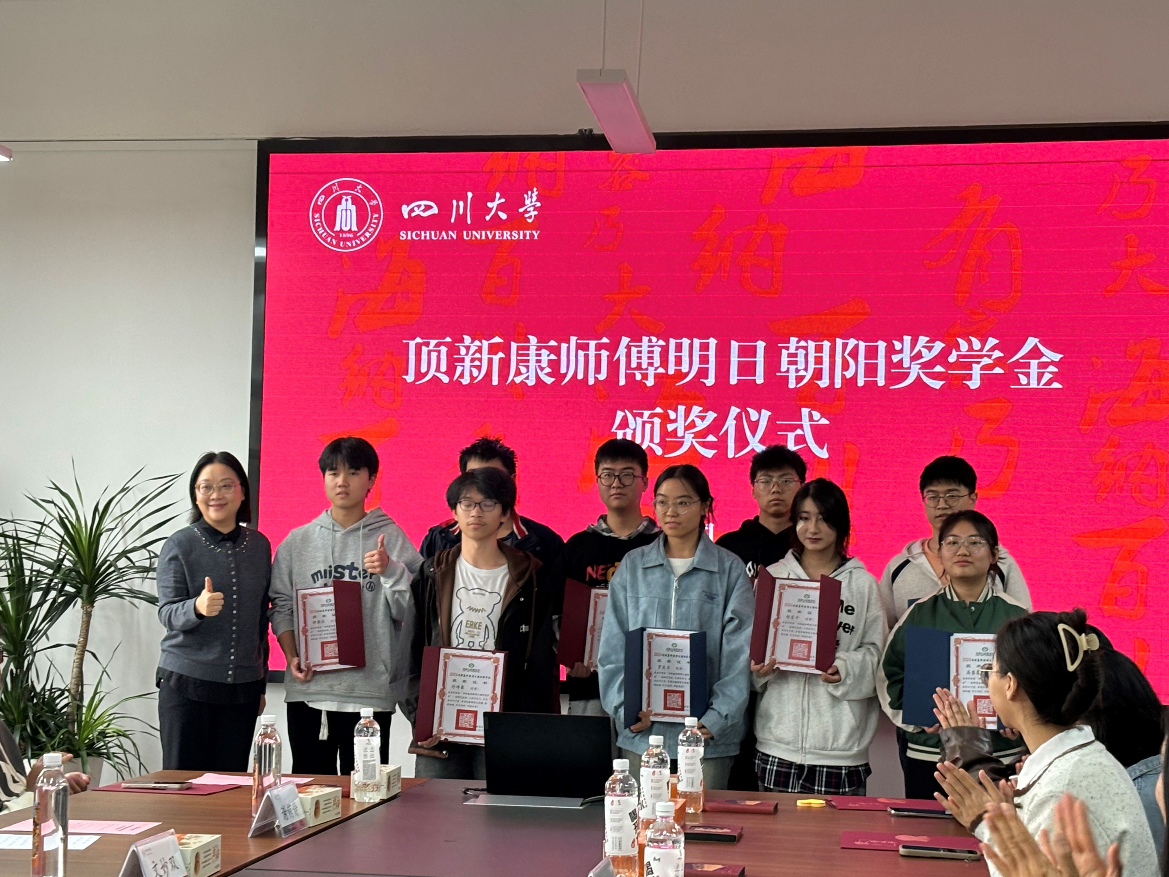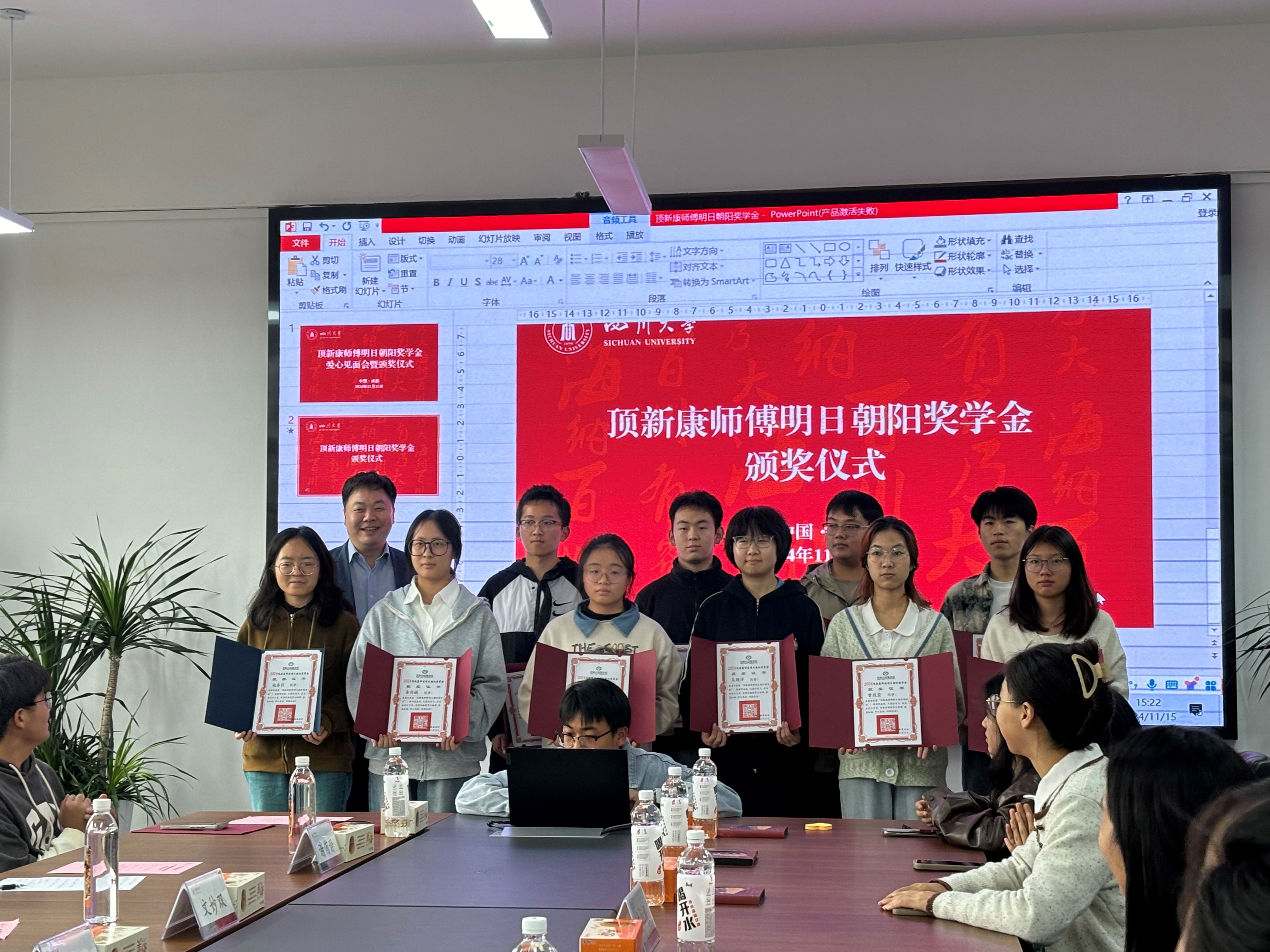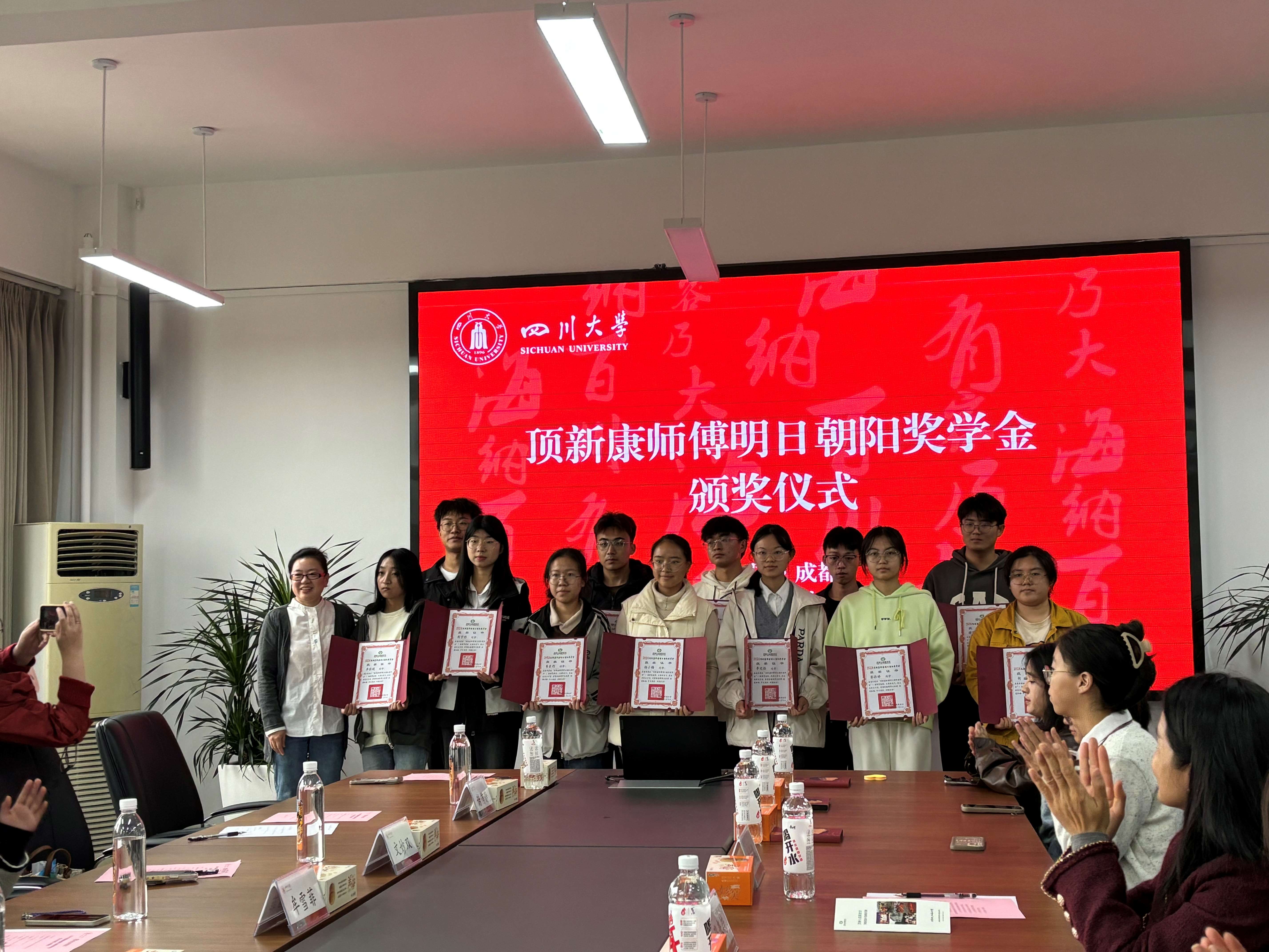 11月15日,顶新康师傅明日朝阳奖学金爱心见面会暨颁奖仪式在四川大学望江校区文华活动中心410会议室圆满举行。顶新公益基金会项目主管司然、项目专员陆瀚达、谢侑静,顶新集团餐饮群川渝地区公司资深经理牟雪菲、行政专员文妙双,顶新集团康师傅公司西南区董事长谭莉、公共事务经理斯婉君,顶新集团西南全家便利总监杨蕾,四川省台湾事务办公室经济处处长罗彬,四川大学教育基金会副秘书长贾秀娥,学工部副部长卢希芬,以及我校相关单位工作负责人与今年的获奖学生一起参加了本次见面会。